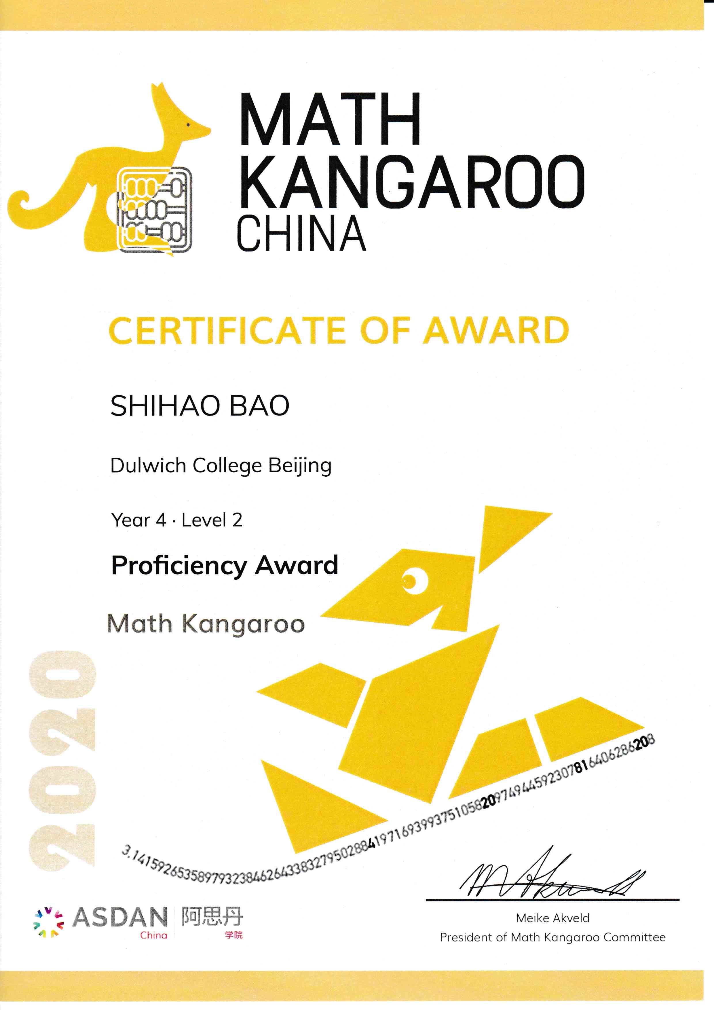 2020 Math Kangaroo China Level 2 – Proficiency Award