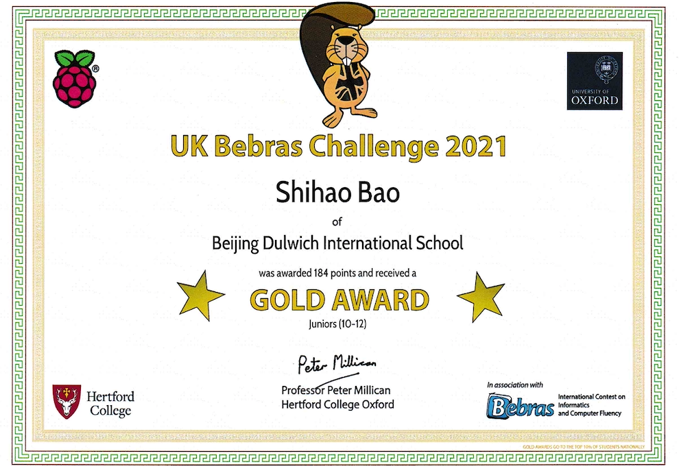 2021 UK Bebras Challenge Certificate of Gold Award Juniors (10-12)