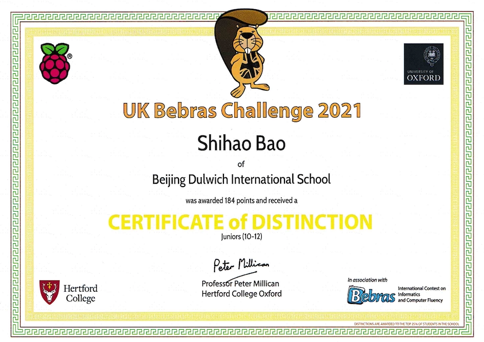 2021 UK Bebras Challenge Certificate of Distinction Juniors (10-12)