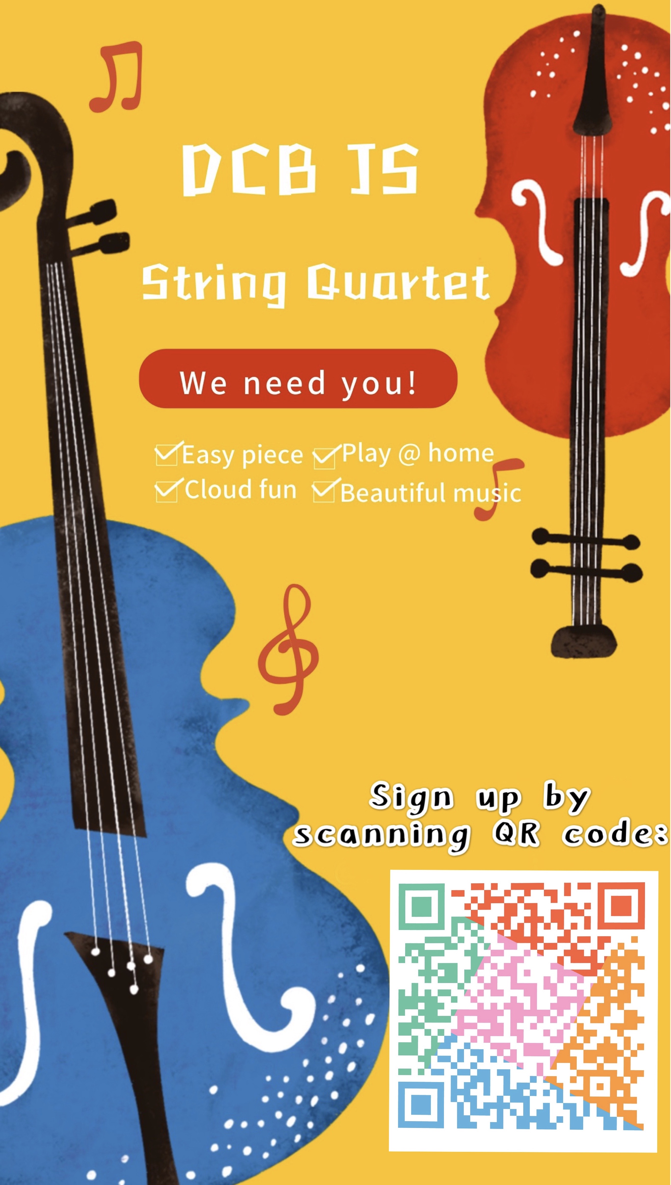 Junior School String Quartet Club FounderSelf-designed Junior School String Quartet Club recruiting poster2020 Nearer, My God, to Thee – String Quartet Cloud Video Producer – Tribute to people who died in COVID-19